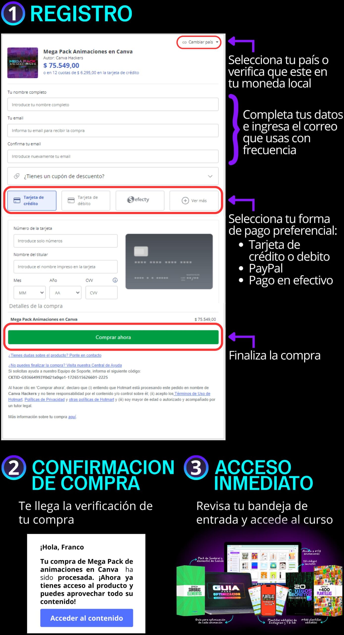 El pago es a través de la plataforma de Hotmart, con pagos seguros y con múltiples métodos de pago dependiendo de tu país. También te hace la conversión automática a tu moneda local.